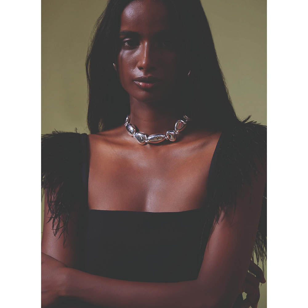 Description : The Casablanca dress is an a-line dress with ostrich fur detailing at the shoulders. It fits slightly fitted at bust and falls loosely over stomach and hips. It's made in crepe and is above knee length.