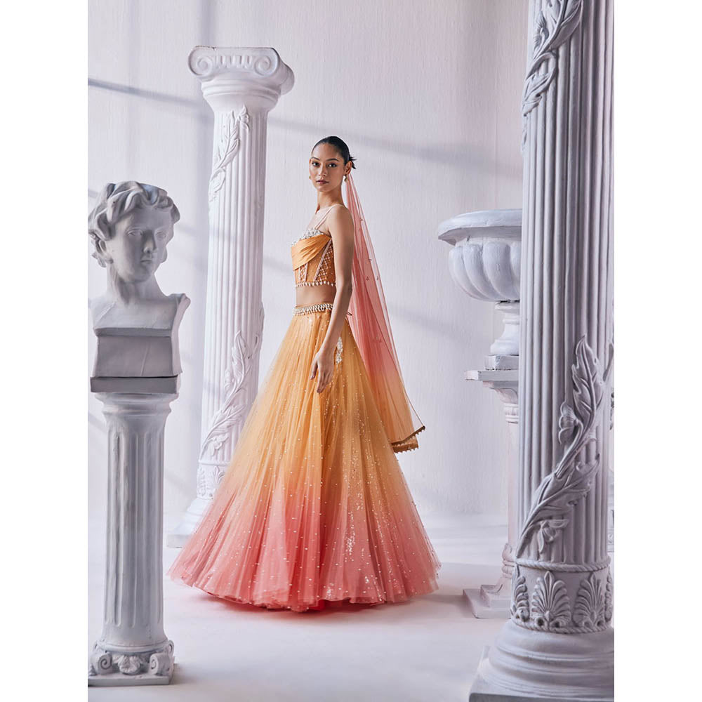 Description : Enhance your style with this fancy orange set from Mandira Wirk. Made from high-quality net, this set includes satin georgette ombre lehenga in sequin and pearl detail . Style it with minimal jewellery and sandals to complete the ensemble.