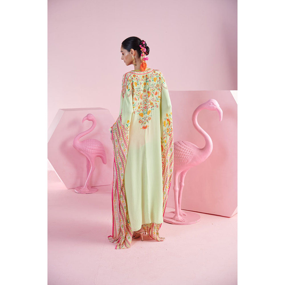 Description : Adorn the ethnic bliss with this green Co-ord Set from MANDIRA WIRK. Made from high quality crepe, it features pull on closure and floral pattern along with flared sleeves & plunging neck design. Pair it with wedges or heels and some jewellery to complete your ensemble.