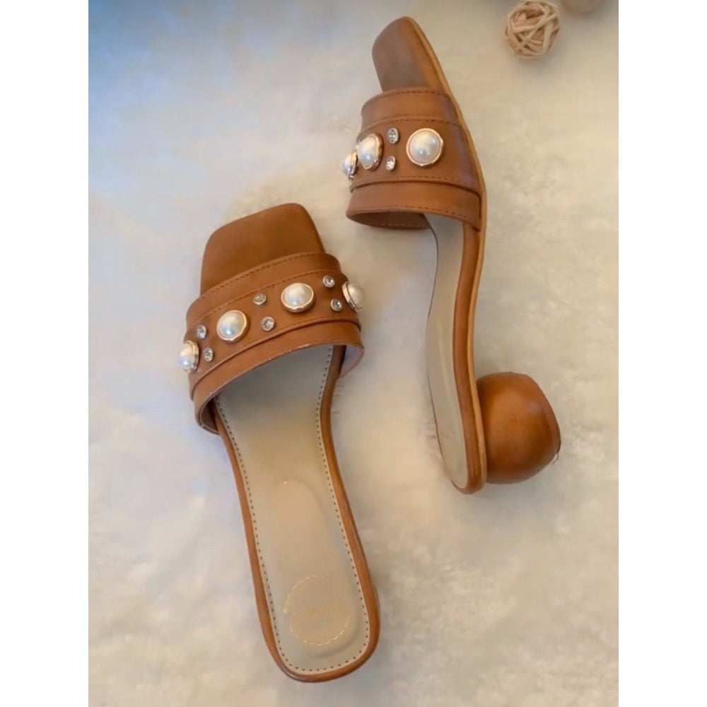 Tan Round Pearl Brown Heels