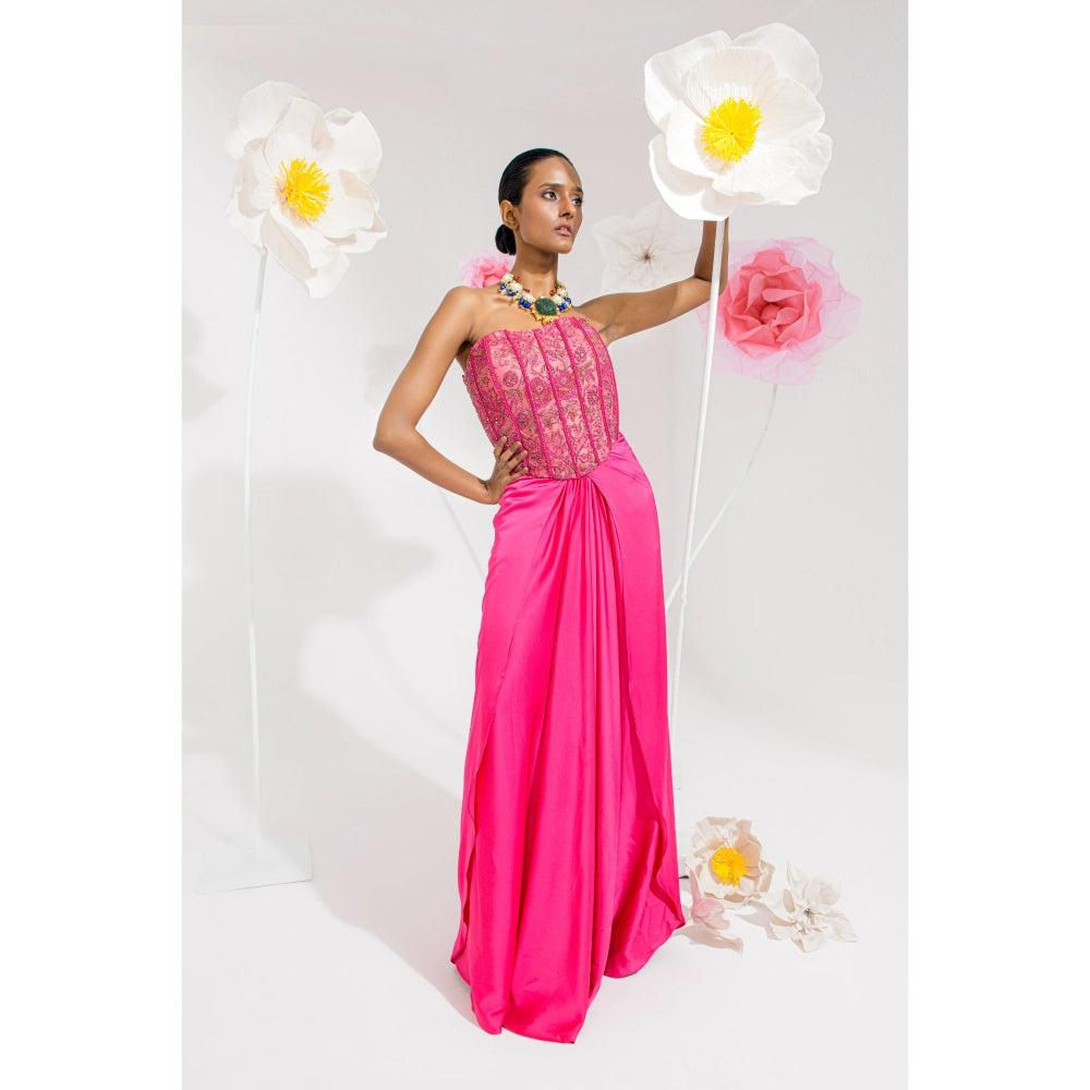 Description : The Hoor Ensemble, Inspired By The Delicate Beauty Of Wildflowers, Presents An Elegant Blend Of Modern Refinement and Timeless Charm. The Set Features A Corset and Draped Skirt, Designed To Highlight Intricate Craftsmanship and Grace. The Corset Is Crafted From Luxurious Satin, Providing A Smooth, Polished Surface That Drapes Beautifully On The Body. It Is Adorned with Exquisite Hand Embroidery, Incorporating Floral Motifs Reminiscent Of Blooming Wildflowers. The Embroidery Techniques Used On The Corset Are A Fusion Of Intricate Threadwork, Delicate Bead Embellishments, and Subtle Sequin Accents, All Designed To Add Depth and Texture To The Piece. The Vibrant Fuchsia Pink Hue Of The Fabric Adds A Bold Yet Sophisticated Touch, Making It A Statement Piece. The Corset Is Paired with A Graceful Draped Skirt, Crafted From A Combination Of Satin and Fine Net. The Soft, Flowing Fabric Of The Skirt Contrasts with The Structured Corset, Creating A Harmonious Balance Between Strength and Femininity. The Net Overlay Adds A Layer Of Delicacy and Movement To The Design, Allowing for A Fluid, Ethereal Feel As The Wearer Moves.
