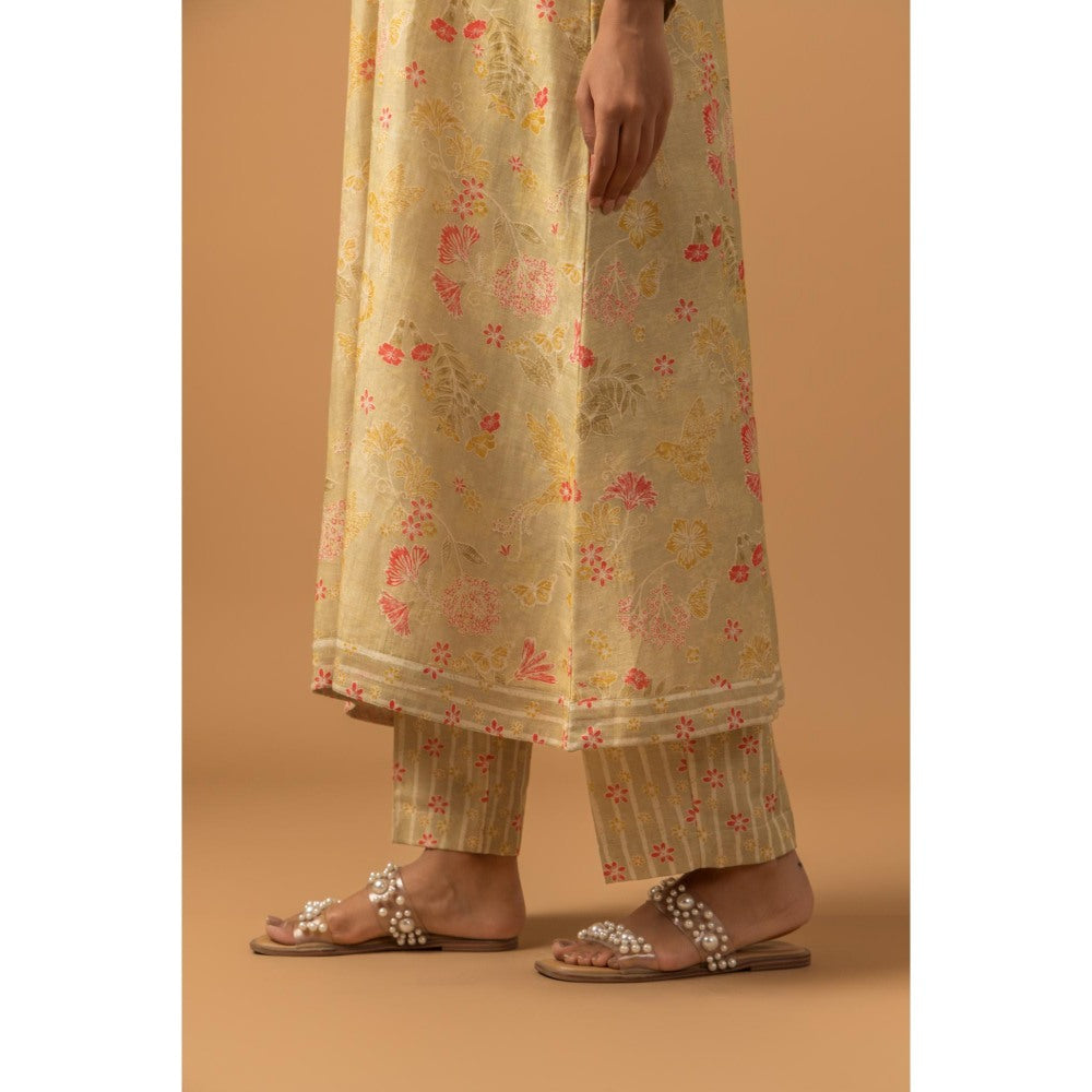Description : Give yourself a flattering look on special occasions with this beige floral co-ord set from Straight. Tailored in a comfortable fit, this alluring kurta is finished with three fourth sleeves and v-neck.