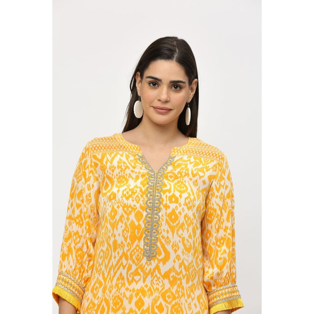 Description : Saffron Ikat Crepe Embroidered Co-Ord Set Hand Embroidered Co-Ord Set With Fringe Detailing On Sleeve.