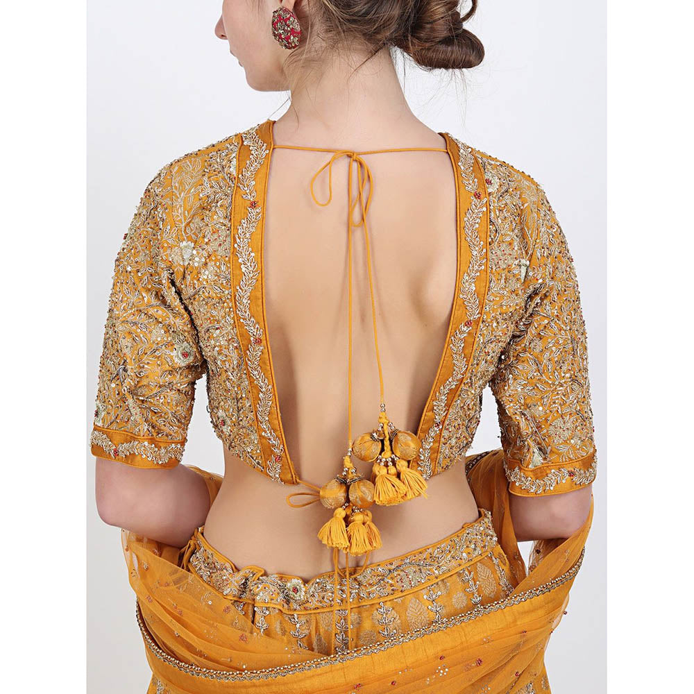 Description : This lehenga set by Nikasha features ochre jaal embroidered blouse with ochre brocade embroidered lehenga and embroidered dupatta.