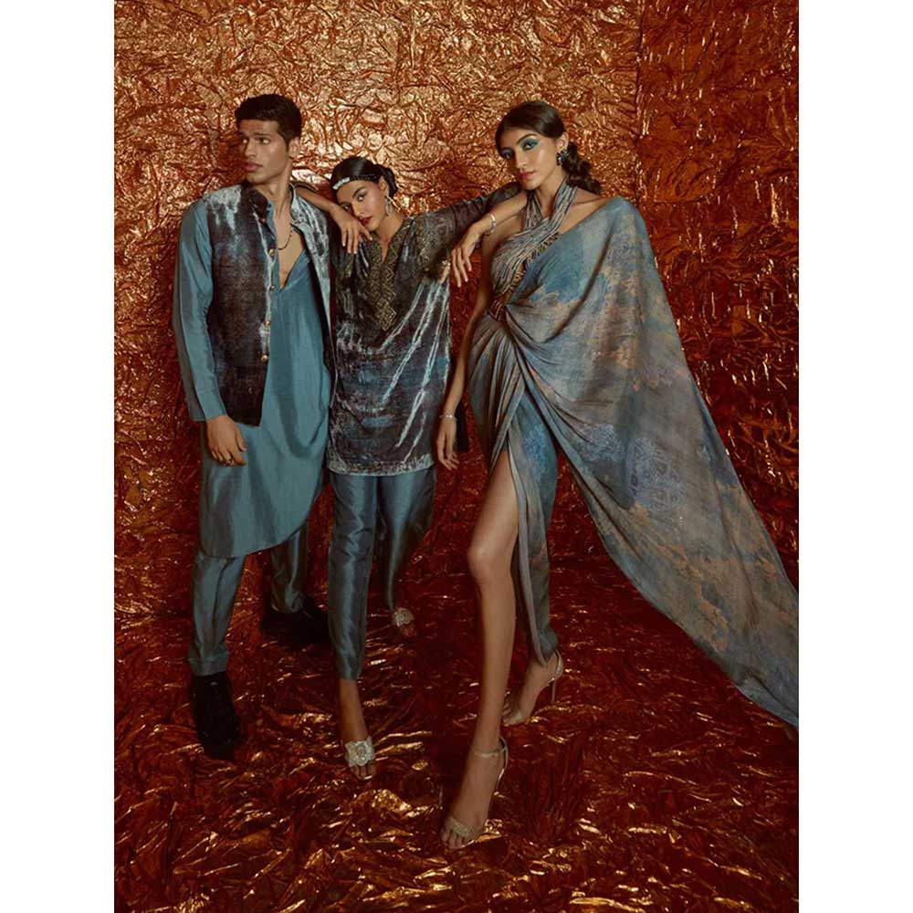 Grey Nokia Silk Kurta with Pants and Printed Velvet Bandi