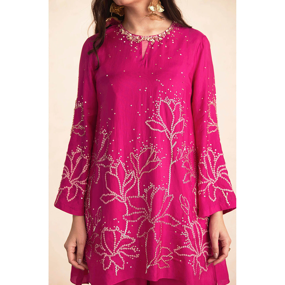 One Not Two Rose Pink Silk Kurti with Pant and Slip (Set of 3)