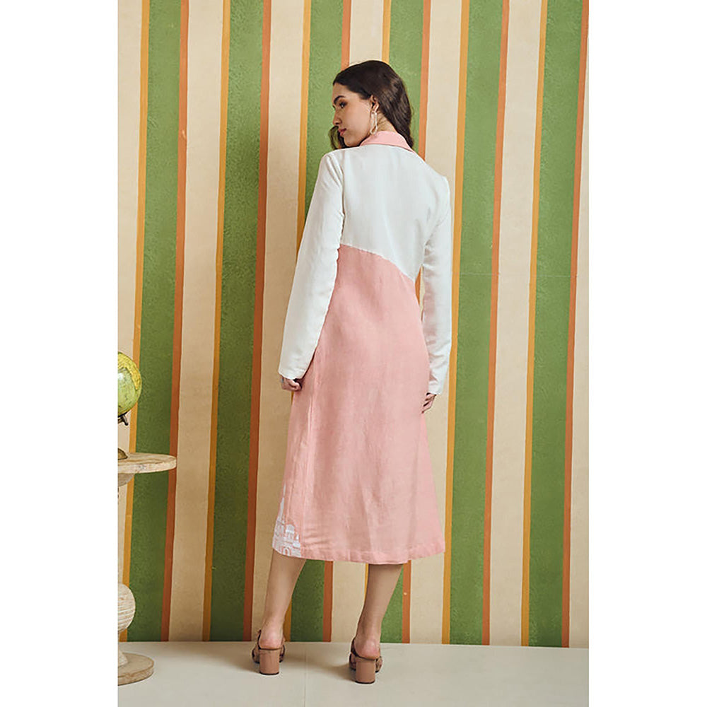 Description : This dress is a graceful fusion of modern geometry and cultural storytelling. Crafted in a two-tone palette with a bold diagonal divide, it features a tailored collar and concealed placket for a clean, composed finish. The upper bodice is delicately outlined with architectural skyline embroidery in tonal thread-suggestive and abstract, adding depth without excess. The lower hem continues the narrative with more intricate threadwork near the base, grounding the silhouette in heritage. Ideal for literary evenings, museum events, or serene daywear, it pairs beautifully with neutral sandals and sculptural jewellery, offering elegance with quiet intention.