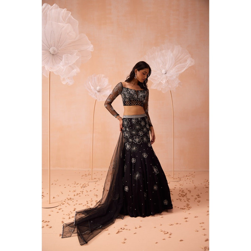 Black Blossom Lehenga With Blouse And Dupatta (Set of 3)