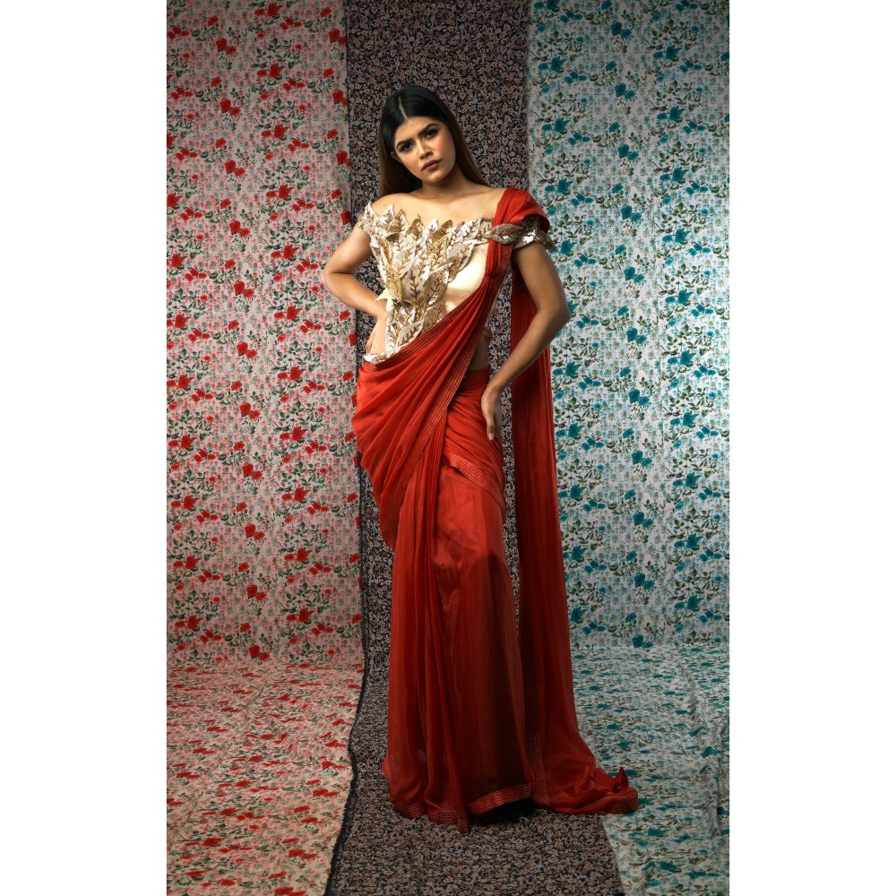 Rust Yards Of Grace Pre Draped Saree with Stitched Blouse