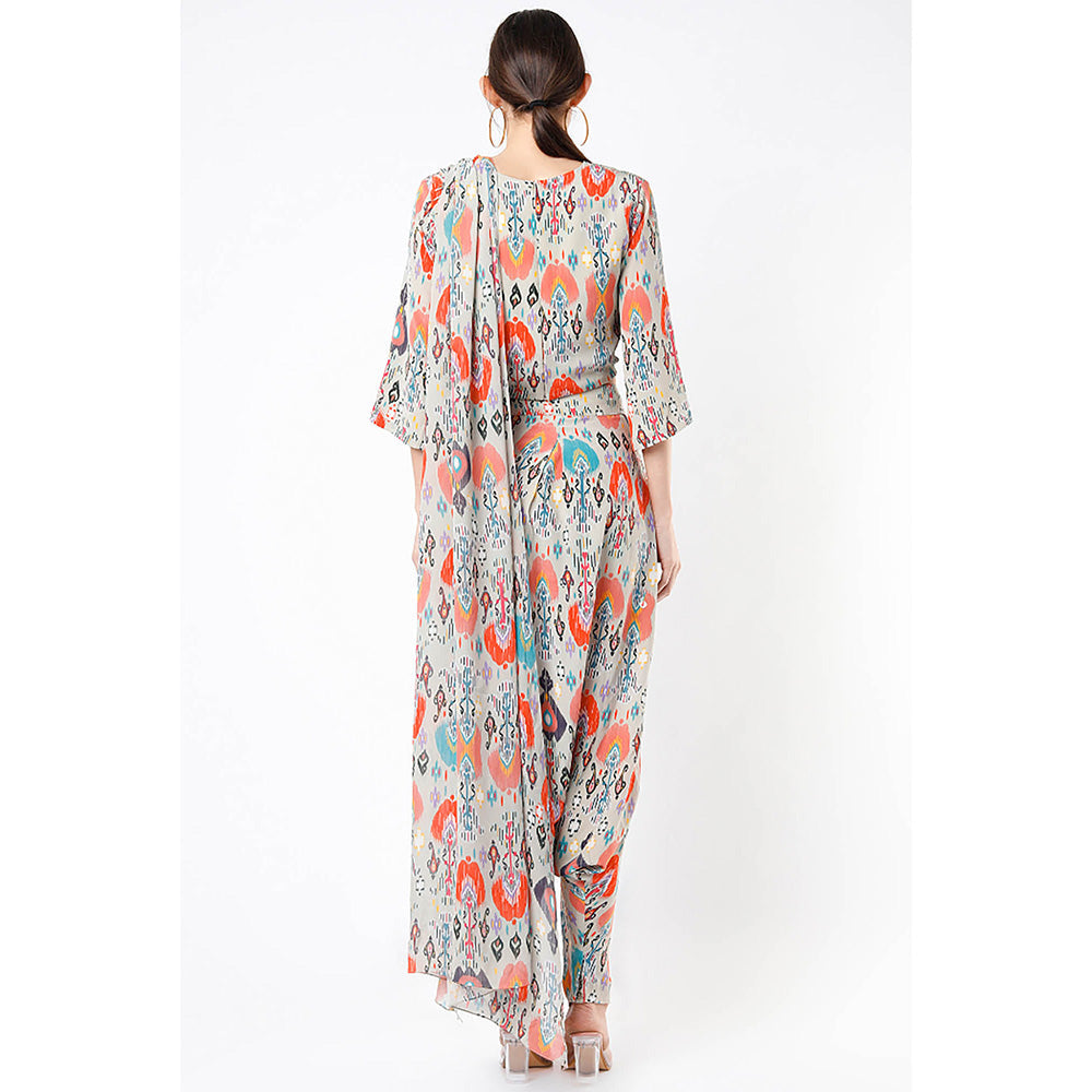 Description : Stone Ikat Garden Print Crepe Top with Low Crotch Pants and Attached Stone Ikat Love Georgette Drape with Tassels.