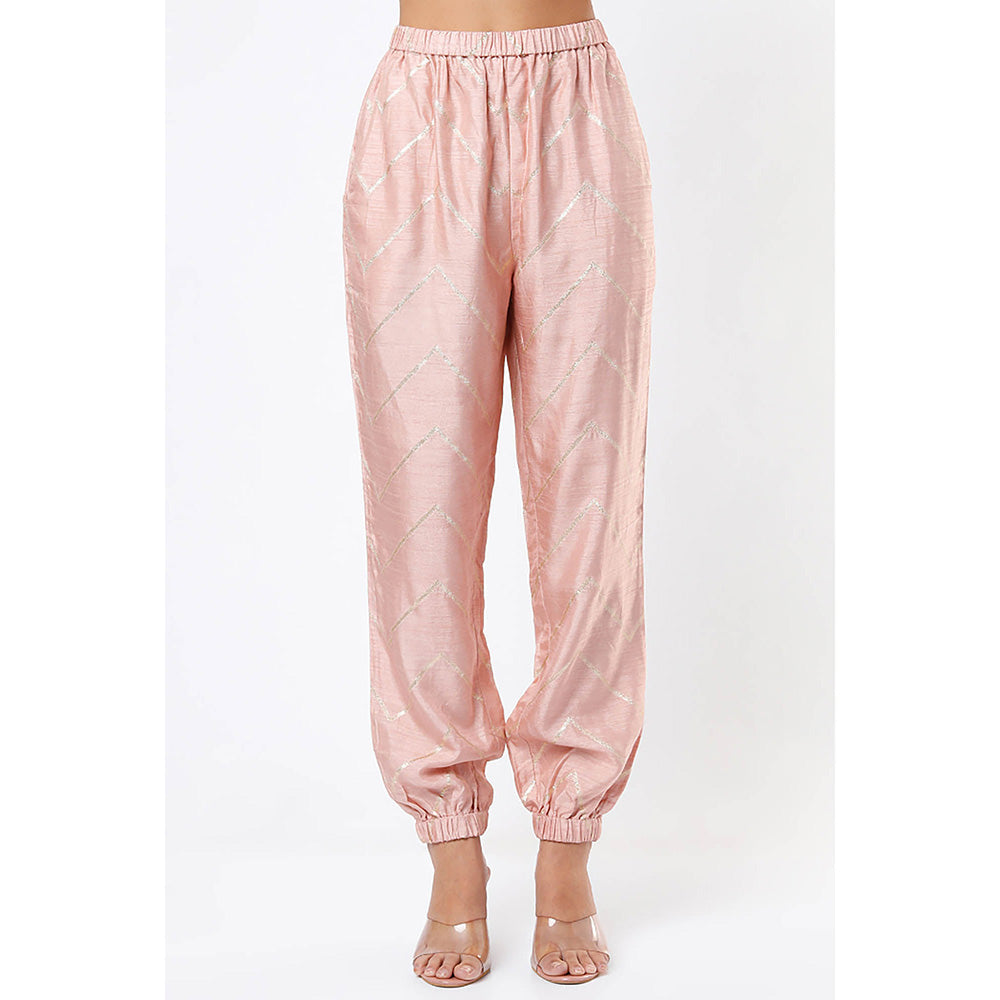 Description : Rose Pink Embroidered Zig Zag Banarasi High Low Kaftan Top with Drawstring and Tassels Detailing and Jogger Pants. Please Note: Top Is Free Size and Bottom Will Be As Per The Standard Size Guide Provided.