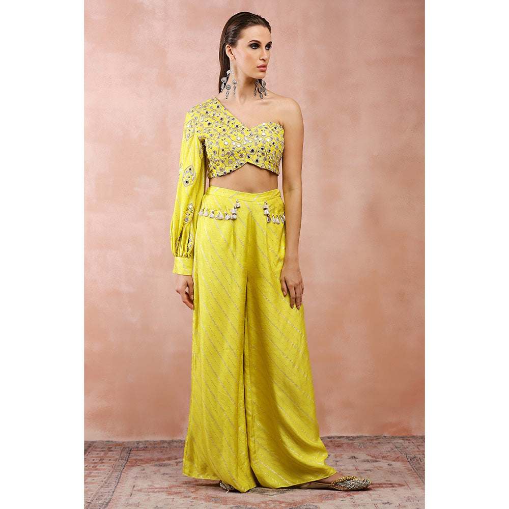 Payal Singhal Yellow Mirror Work One Shoulder Top and Palazzo (Set of 2)