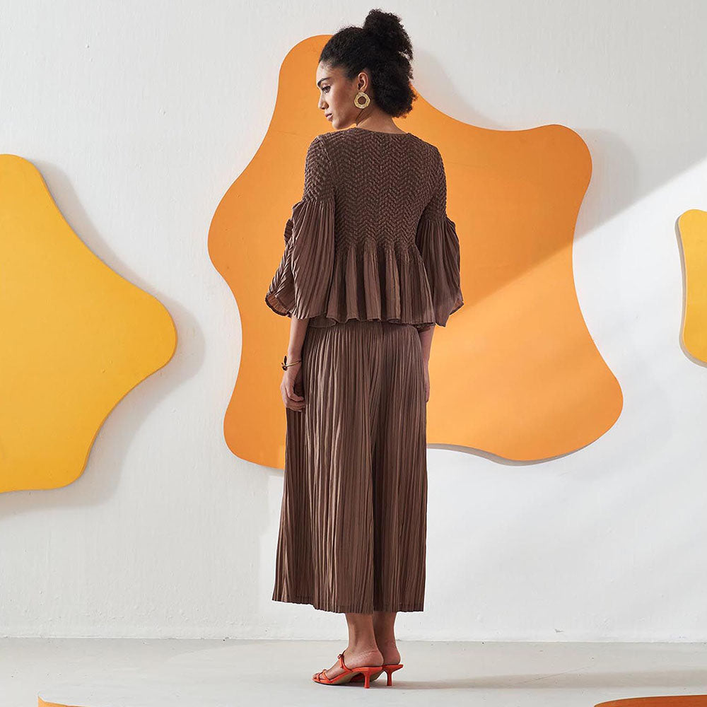 Description : Featuring A Brown Round Neck Top with Crushed Effect On Top and Pleated Ruffle Sleeves In Crepe Base. It Is Paired with Matching Culotte Pleated Pants.