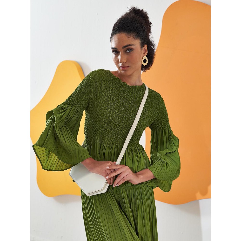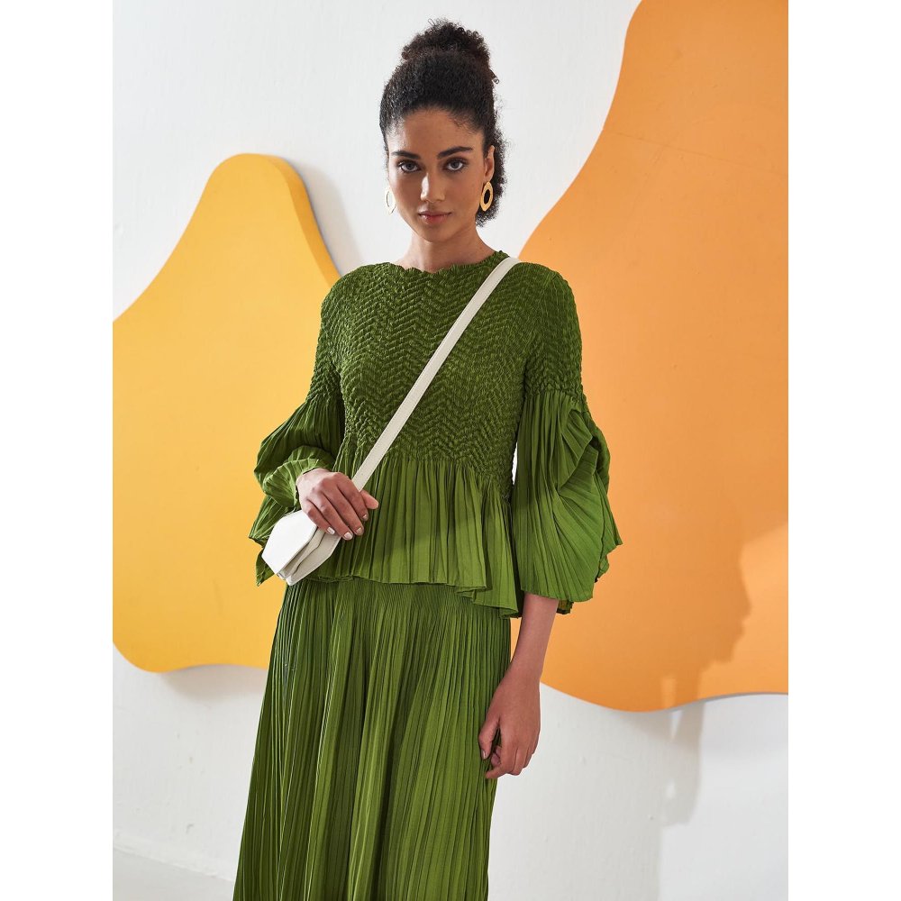 Description : Featuring A Lime Green Round Neck Top with Crushed Effect On Top and Pleated Ruffle Sleeves In Crepe Base. It Is Paired with Matching Culotte Pleated Pants.