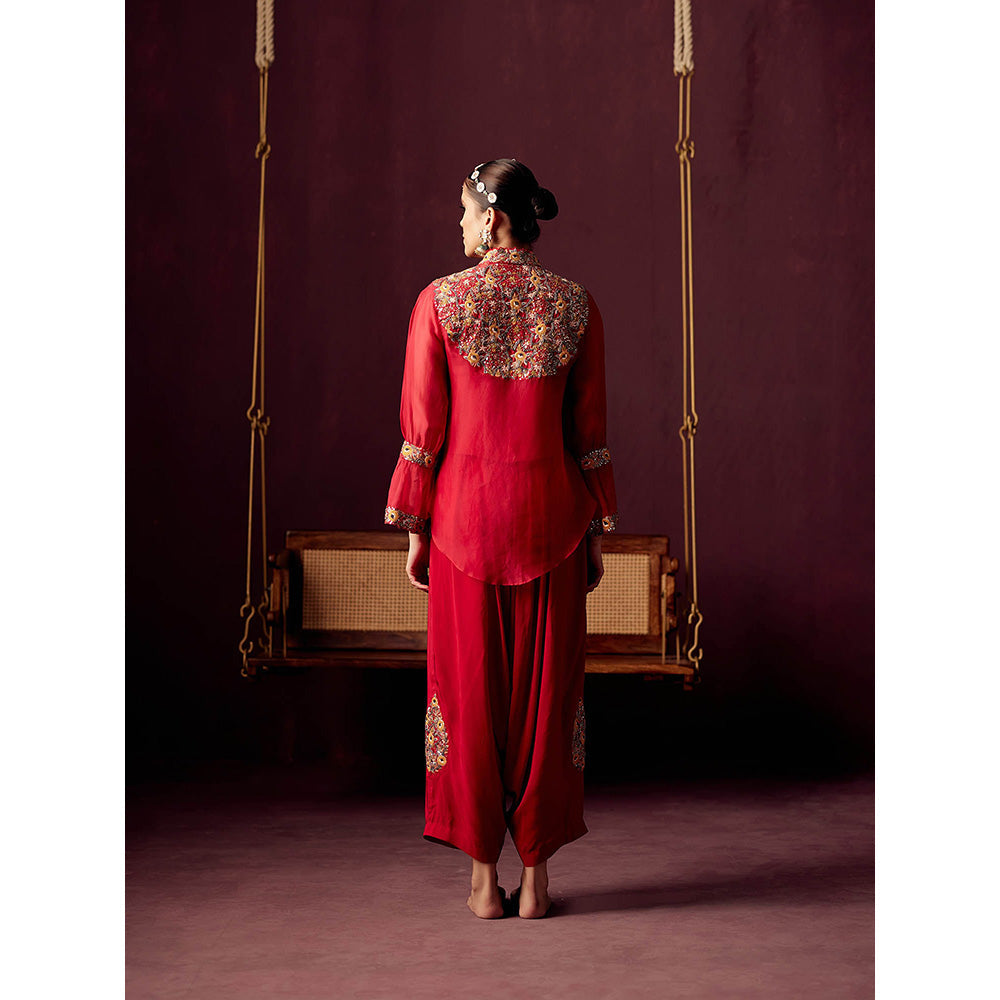 Description : Add this trendy and festive wear shirt pant set with inner from Pooja Singhal.It is crafted from high-quality fabric. It features red embroidered pattern with bell sleeves mandarin neck with front closure closure and tapered mid waist rise style. Team it up with heels and sling bag.
