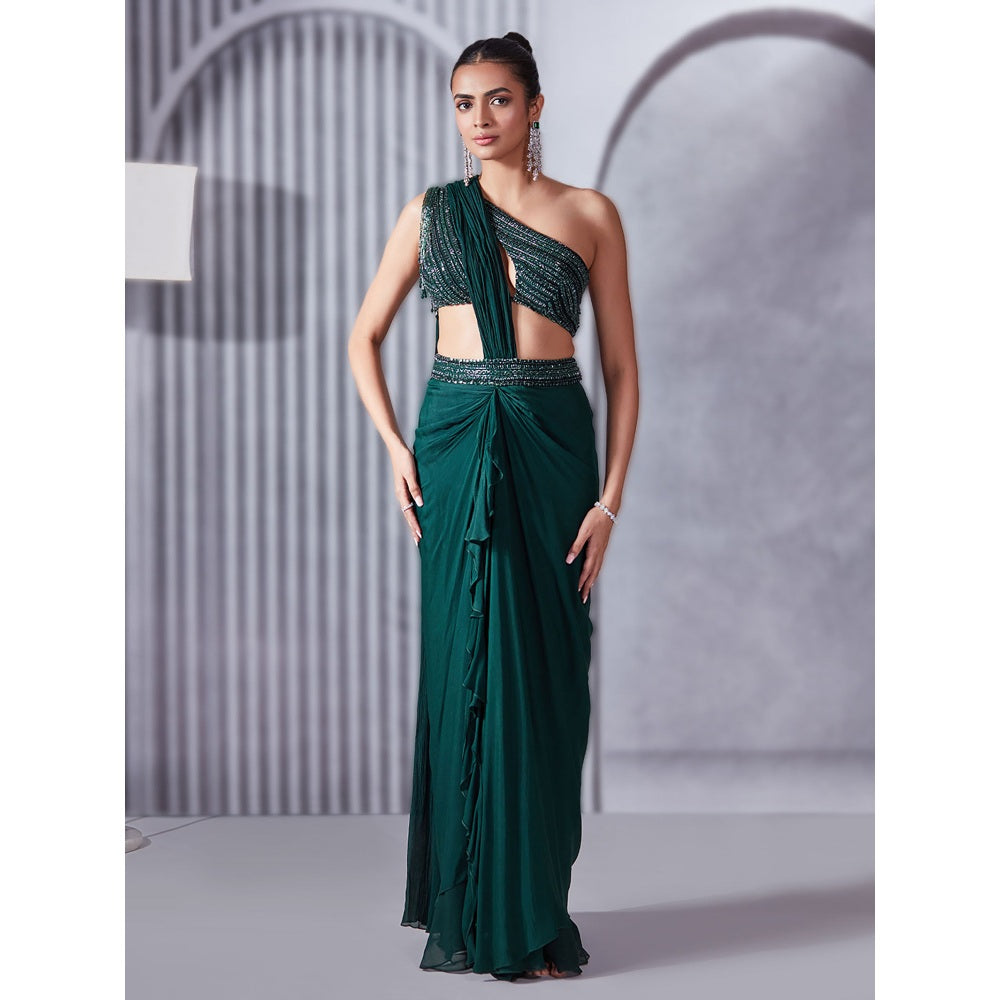 Pritika Vora Forest Green One-Shoulder Draped Saree with Blouse with Stitched