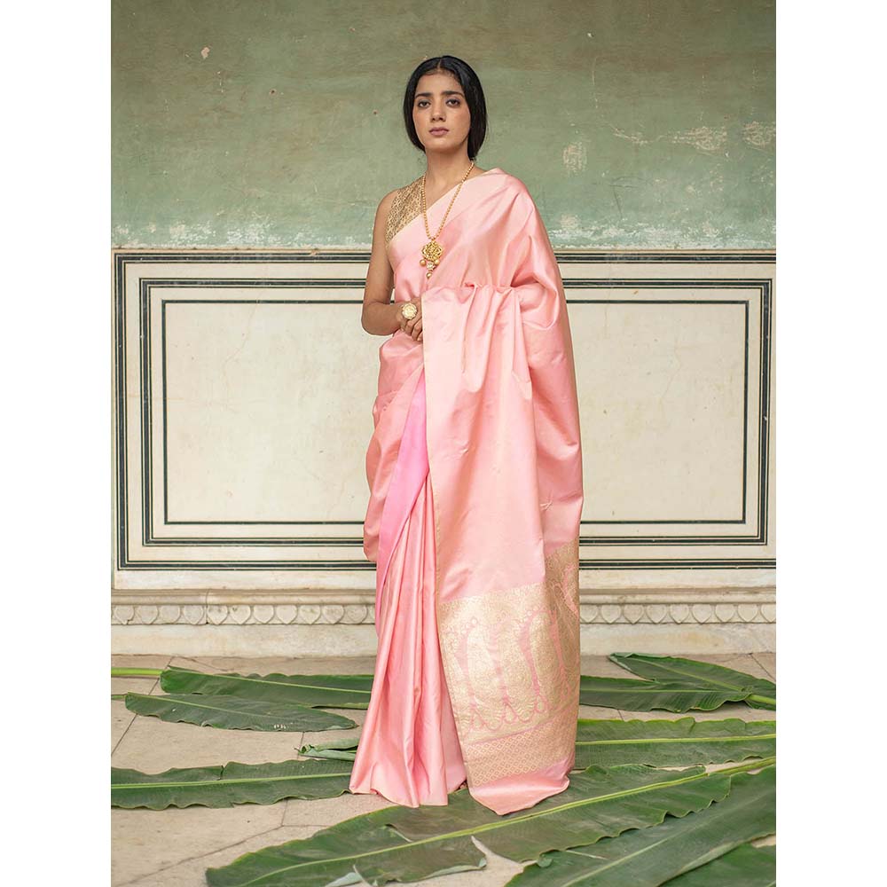 Description : Rose pink Banarasi Silk Mashroo saree with detailed paisley palla woven in vintage gold zari in kadua technique. The saree is paired with Zane, gold brocade blouse with pink waistband.