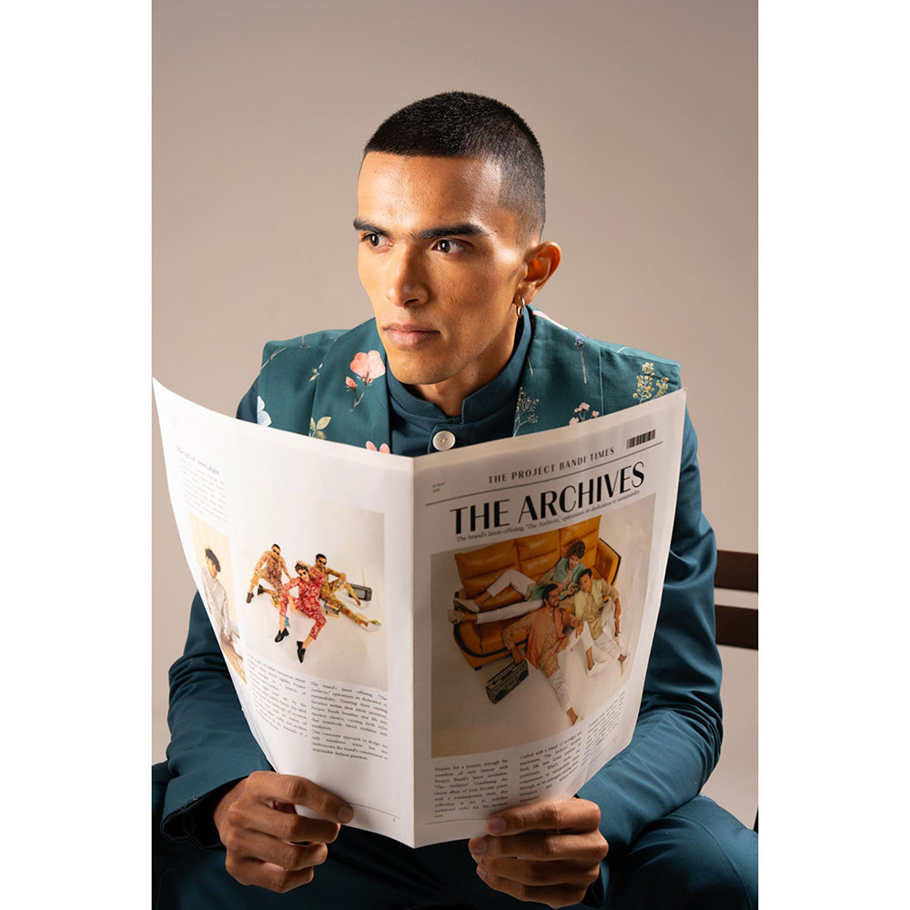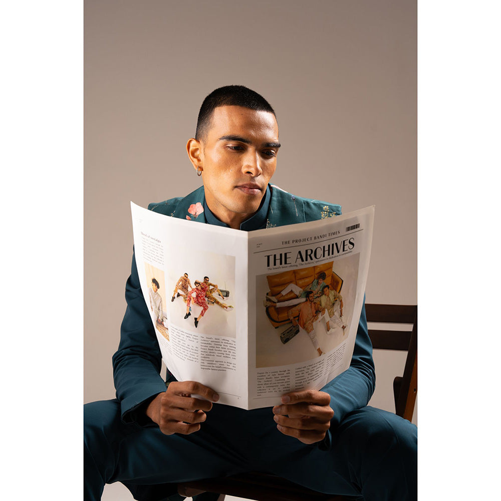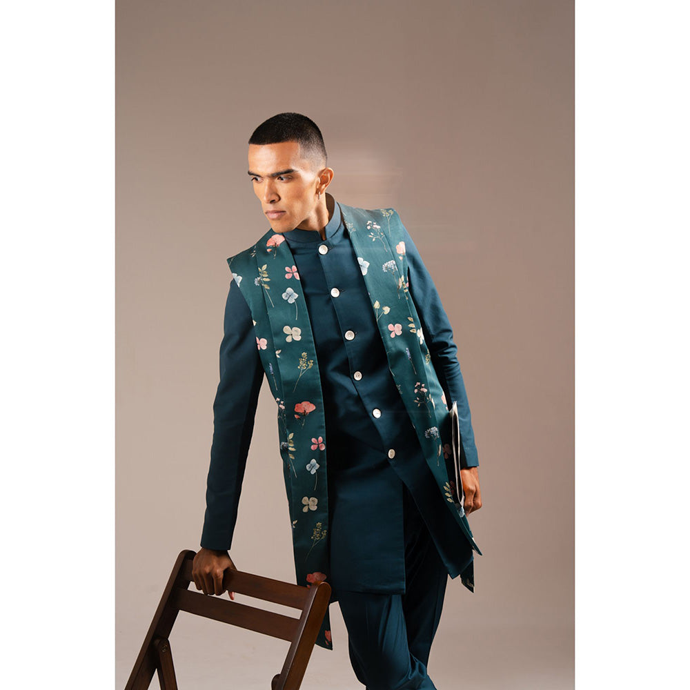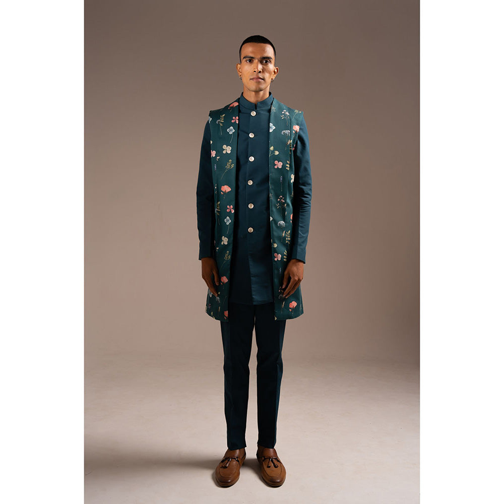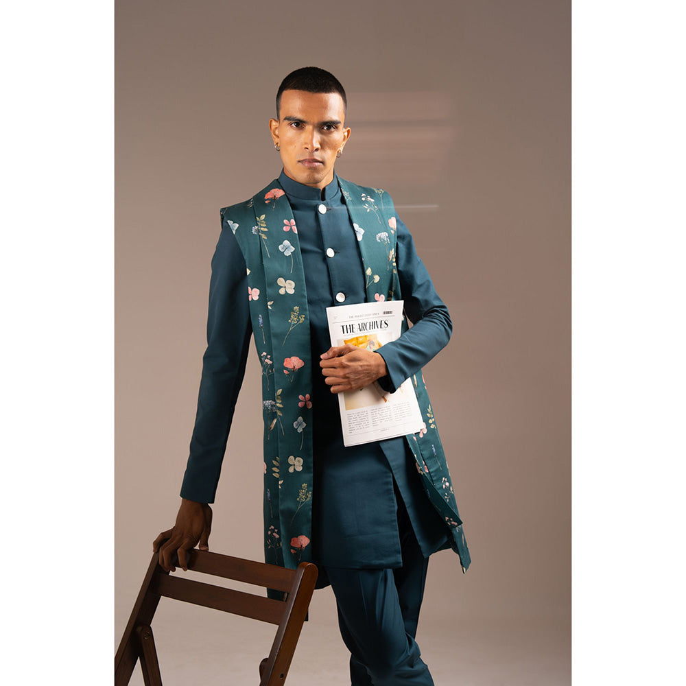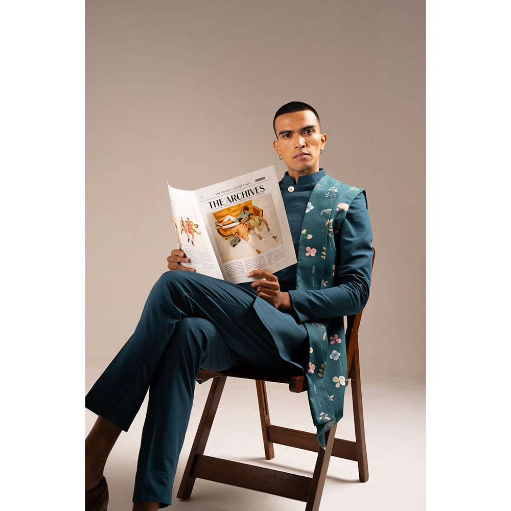 Description : The Teal Mila Bandhgala Set Includes A Teal Bandhgala with A Matching Pyjama Set and A Sleeveless, Long Open Bandi Worn Over The Bandhgala. This Is A Three-Piece Cotton Set. The Bandhgala Has A Mandarin Collar, Shell Buttons, and A Concealed Pocket Placed Inside The Jacket. The Trouser-Style Pyjama Features An Elasticated Back, Zip and Fly Front Closure, and Two Hip Pockets. The Pyjama Is Cut To A Slim Fit and Has Ankle Slits For Ease Of Wear. The Open Bandi Boasts A Scattered Botanical Print From Our Archives.