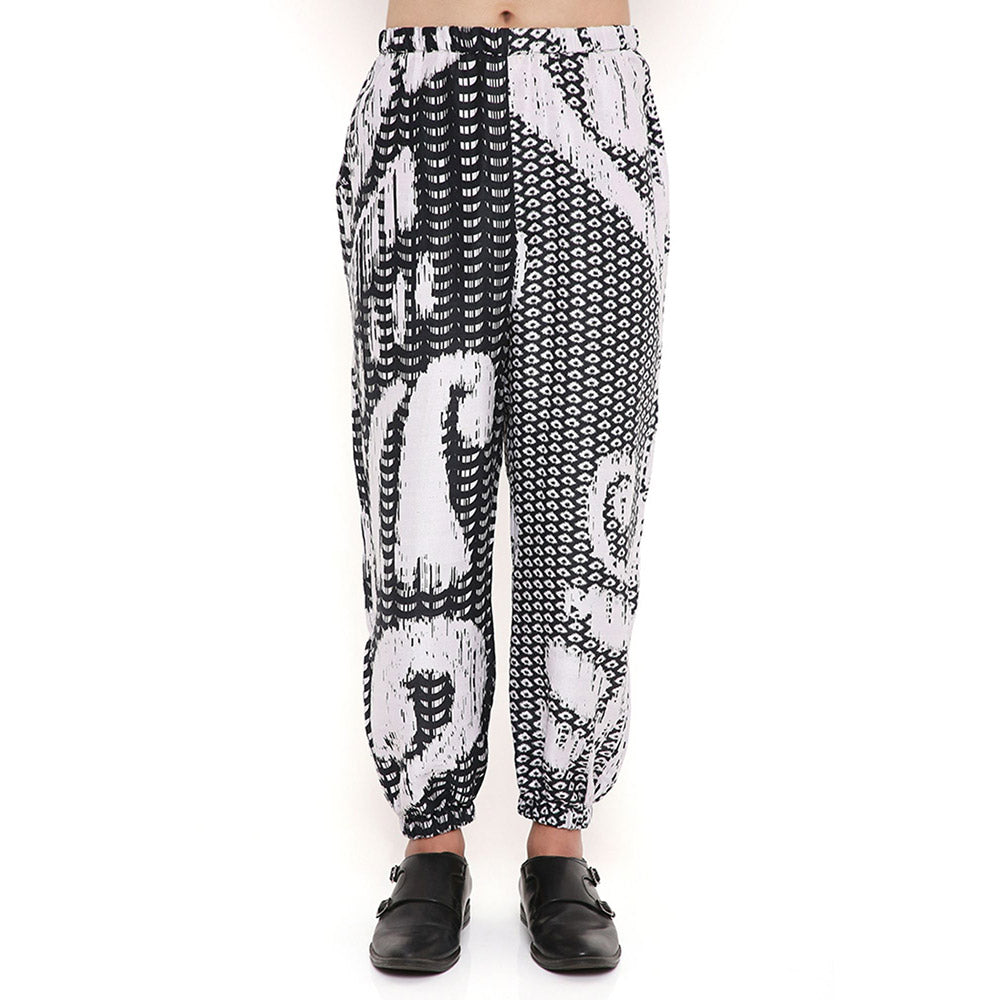 Description : Black & white uzbek print dupion silk pathani kurta with jogger pant.
