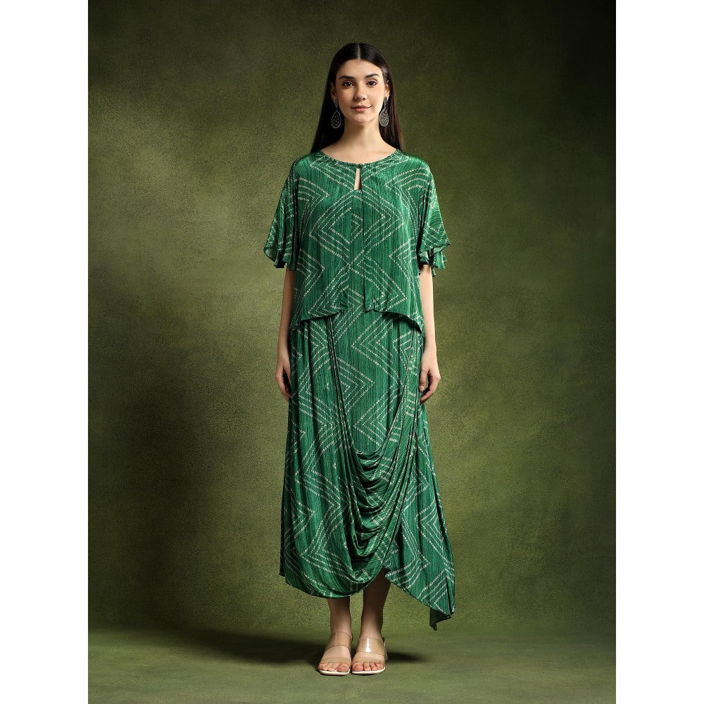 Description : Green Bandhej Printed Satin Cape Dress - A Vibrant Green Satin Cape Dress Highlighted With Traditional Bandhej Prints, Offering A Festive Yet Fashionable Appeal.