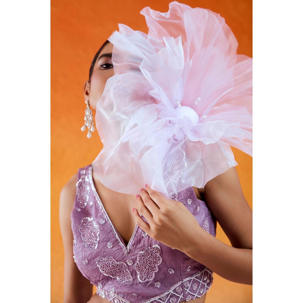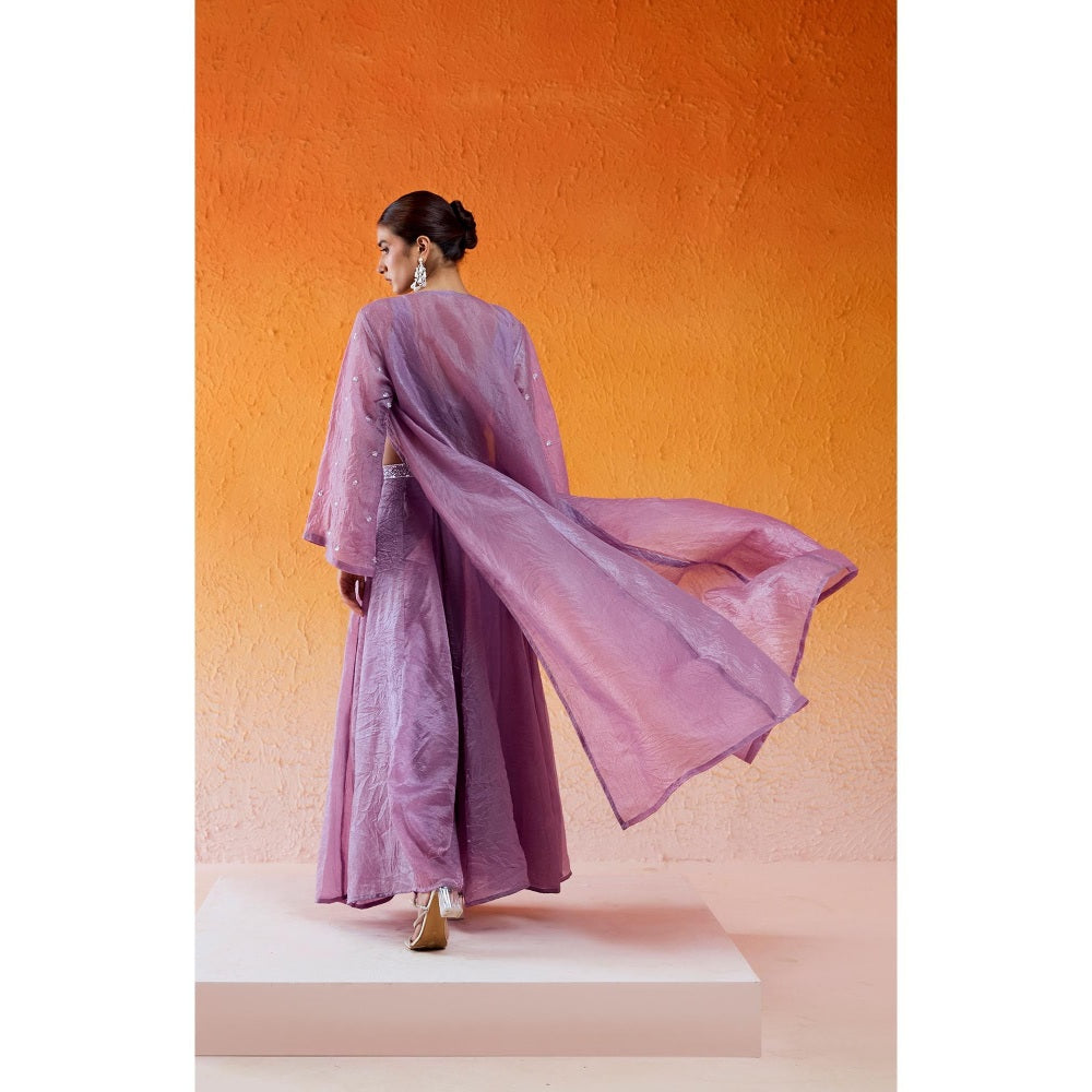 Description : Featuring A Lavender Jacket & Flared Pants In Crushed Organza Fabric With Cut dana, Moti And Sequin Hand Embroidery. It Has An Embroidered Bustier And Jacket.