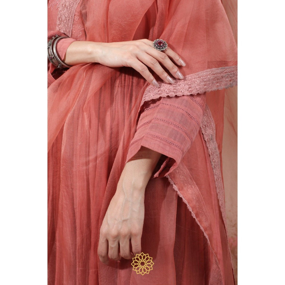 Rhua India Pink Dark Carrot Gathered Kurta with Pant and Dupatta (Set of 3)