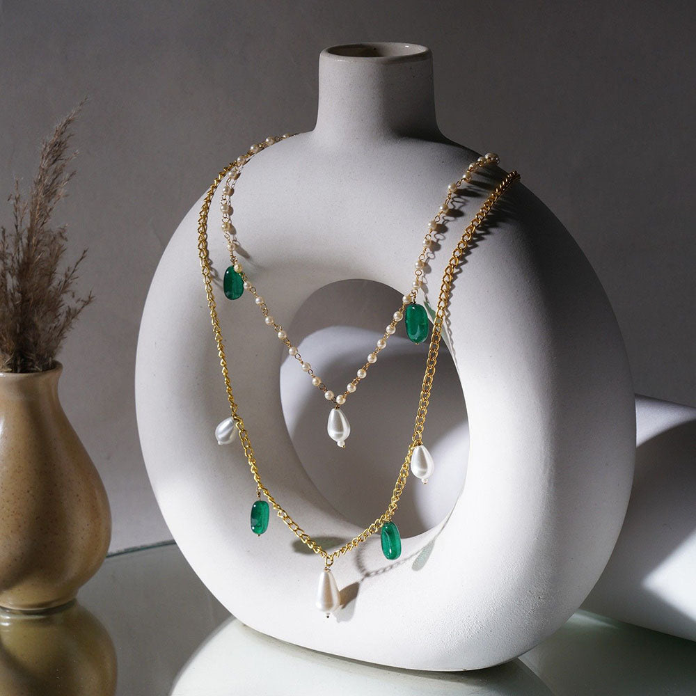 Layered Pearl and Gold Neckpiece with Emeralds