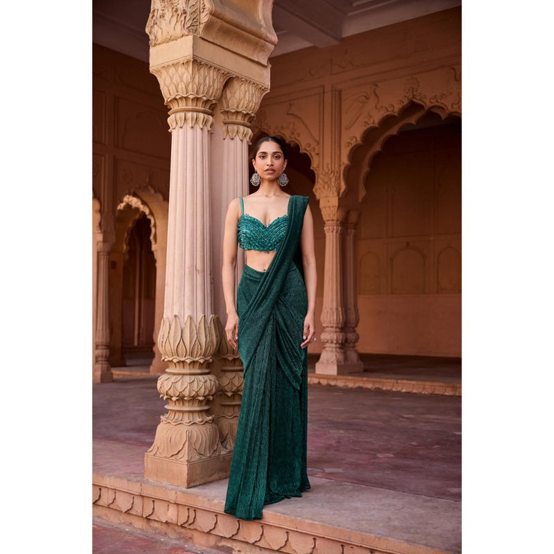 Saanjh by Lea Aazina Emerald Green Pre-Stitched Saree with Stitched Blouse