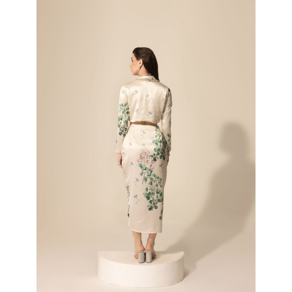 Description : Beige Botanical Printed Cropped Blazer In Luxe Satin, with A Beaded and Embellished Lapel, Paired with A Drawstring Skirt and Embellished Tassels.