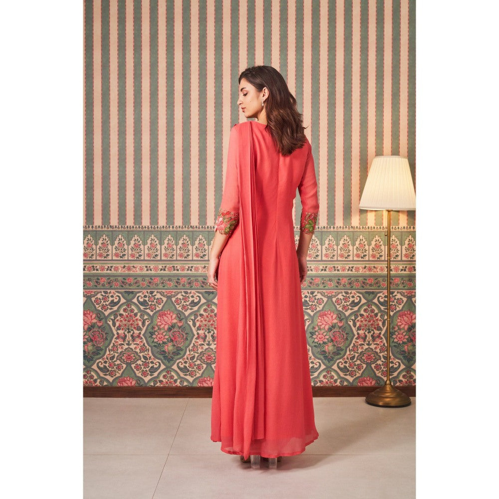 SAMMOHI BY MOKSHA & HIRAL Draped Gown In Coral with Hand Embellishments On Shoulder