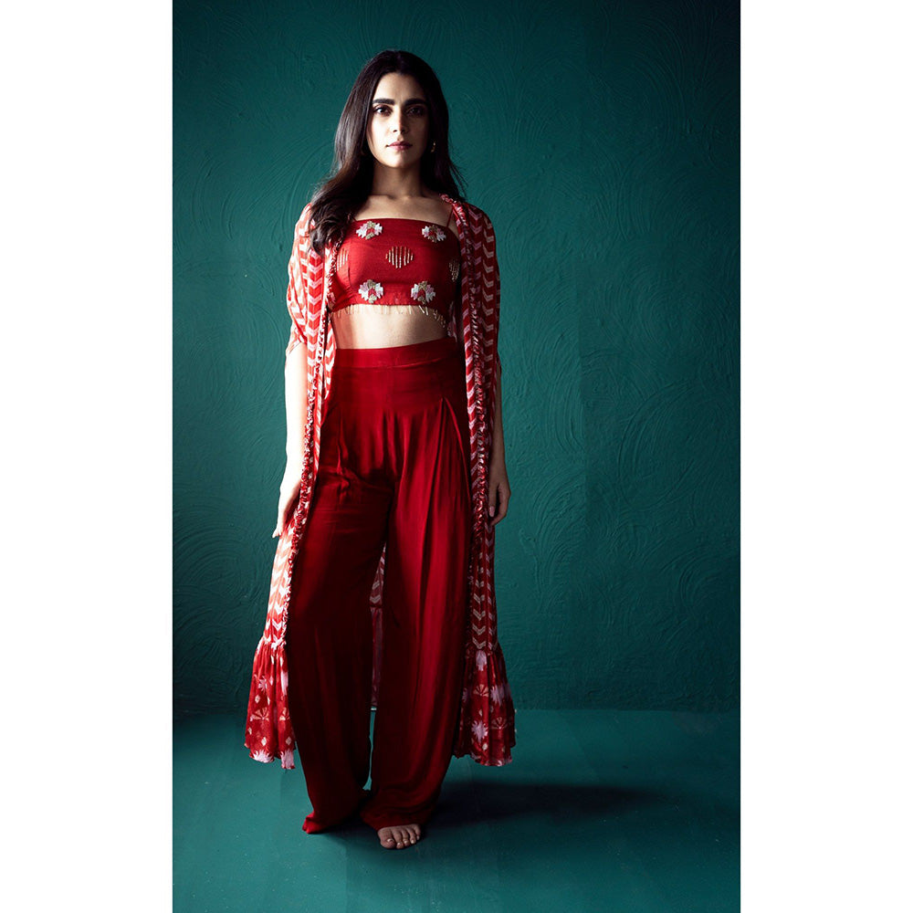 Suave by Neha Arora Surkh Cape With Crop Top And Flared Pant (Set of 3)