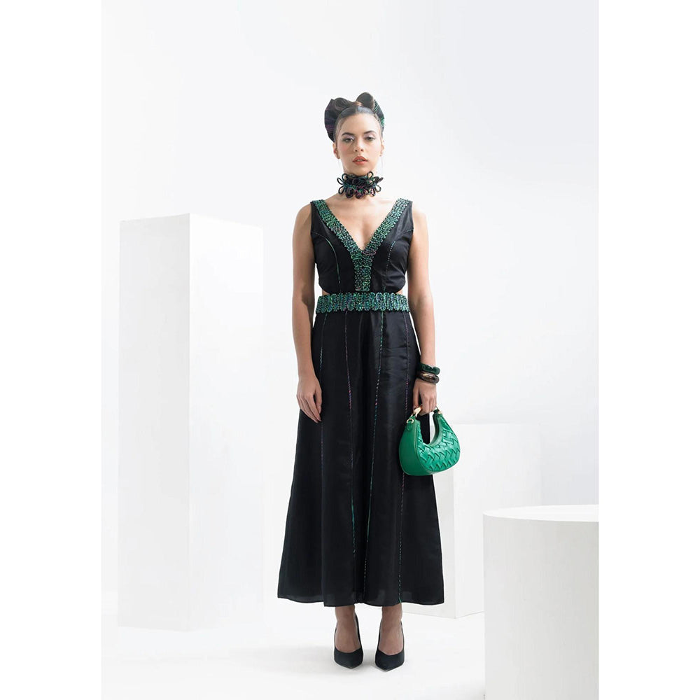 Description : Make a style statement in this black jumpsuit from THE SILK LOVE. Crafted from silk, this stylish jumpsuit is finished with a sleeveless design and a v-neck. Team it with stud earrings and footwear of your choice.