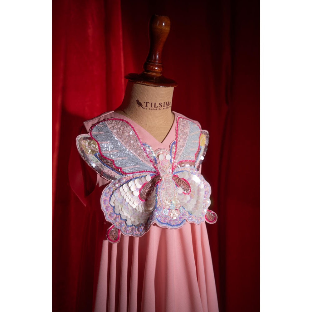 Description : This Enchanting Pink Dress Features A Flowing Silhouette and A Dazzling, Oversized Butterfly Motif Crafted From Sequins On The Bodice. Perfect For Special Occasions, It Brings A Whimsical Touch Of Sparkle and Fantasy To Your Little One's Wardrobe.