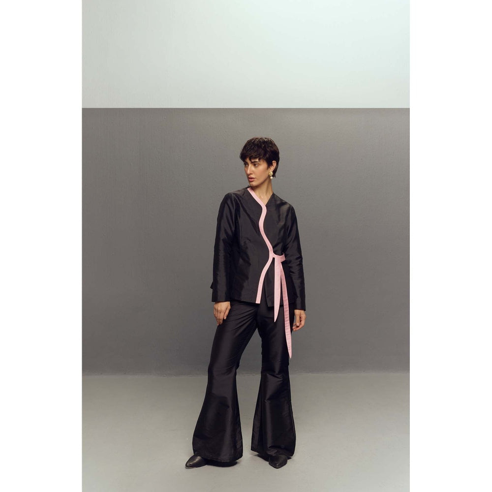 Description : Lend an effortless appeal to your style with this black blazer from Zaitra. Made from high quality silk, it features tie-ups closure and solid pattern along with full sleeves & asymmetrical design. Pair it with shoes or loafers to complete your ensemble.