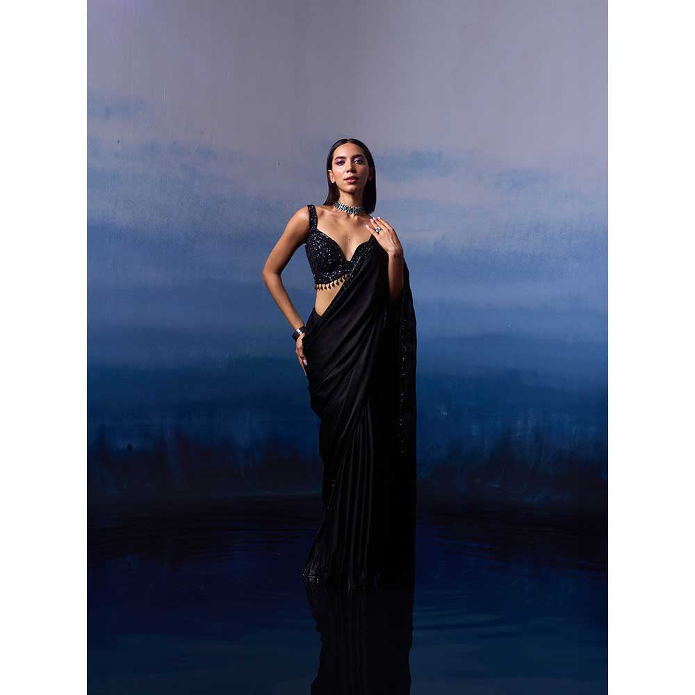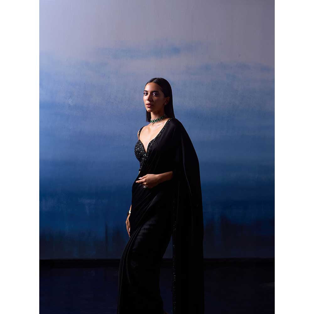 Description : Get This Beautiful And Trendy Black Saree From Angad Singh. It Is Crafted From High-Quality Fabric. This Elegant Blouse Features Sleeveless, Shoulder Straps Style. Whether It'S A Wedding, A Festive Celebration, Or A Grand Event, This Piece Is Perfect For You. Pair It With Traditional Jewelry To Complete Your Regal Look.
