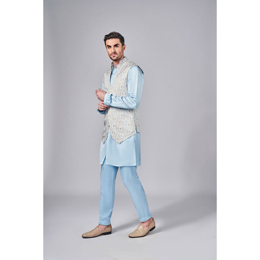 Description : Frozen Blue All Over Printed Angular Cut Bundi With Metallic Zipper Detail. Tailored to sartorial perfection from premium quality fabric, it assures a soft and soothing touch against the skin. The exquisite silhouette adds to its appeal.