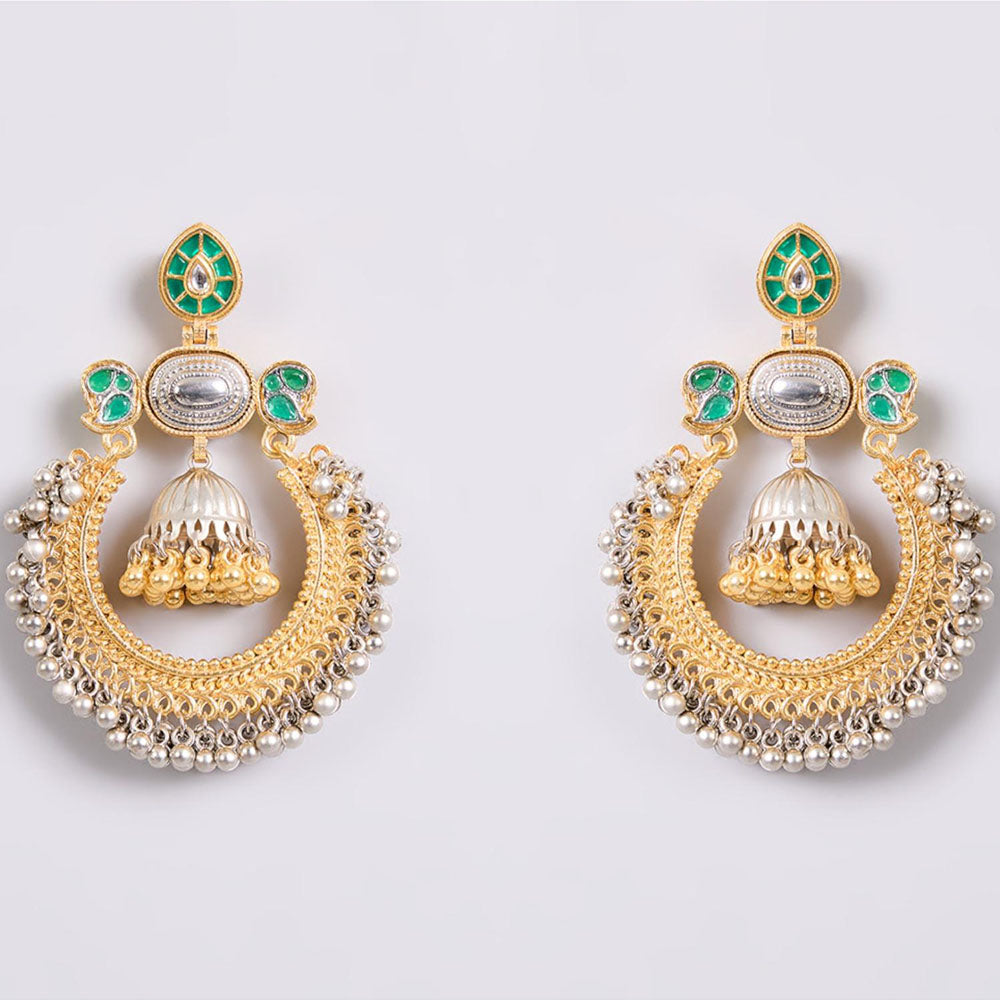 Description : Celebrate Timeless Elegance with These Beautifully Crafted Gold and Silver-Plated Chandbali Earrings. Featuring Intricate Filigree Work, Green Enamel Accents, and A Central Kundan-Style Stone, These Earrings Also Showcase A Delicate Dome-Shaped Jhumka Drop Adorned with Tiny Metallic Beads. Ideal For Festive Occasions, Weddings, Or Ethnic Celebrations, This Regal Piece Blends Traditional Rajasthani Artistry with A Modern Flair.