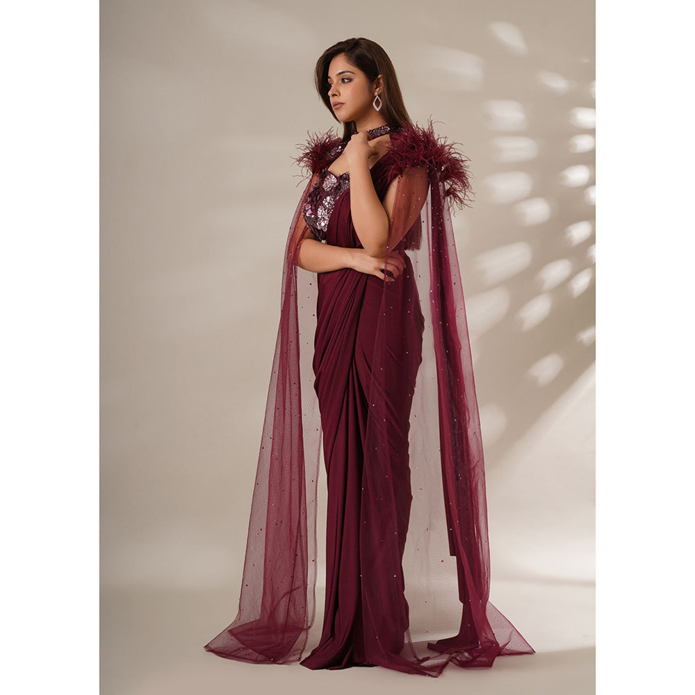 Embellished Maroon Pre-Drape Saree with Stitched Blouse and Cape
