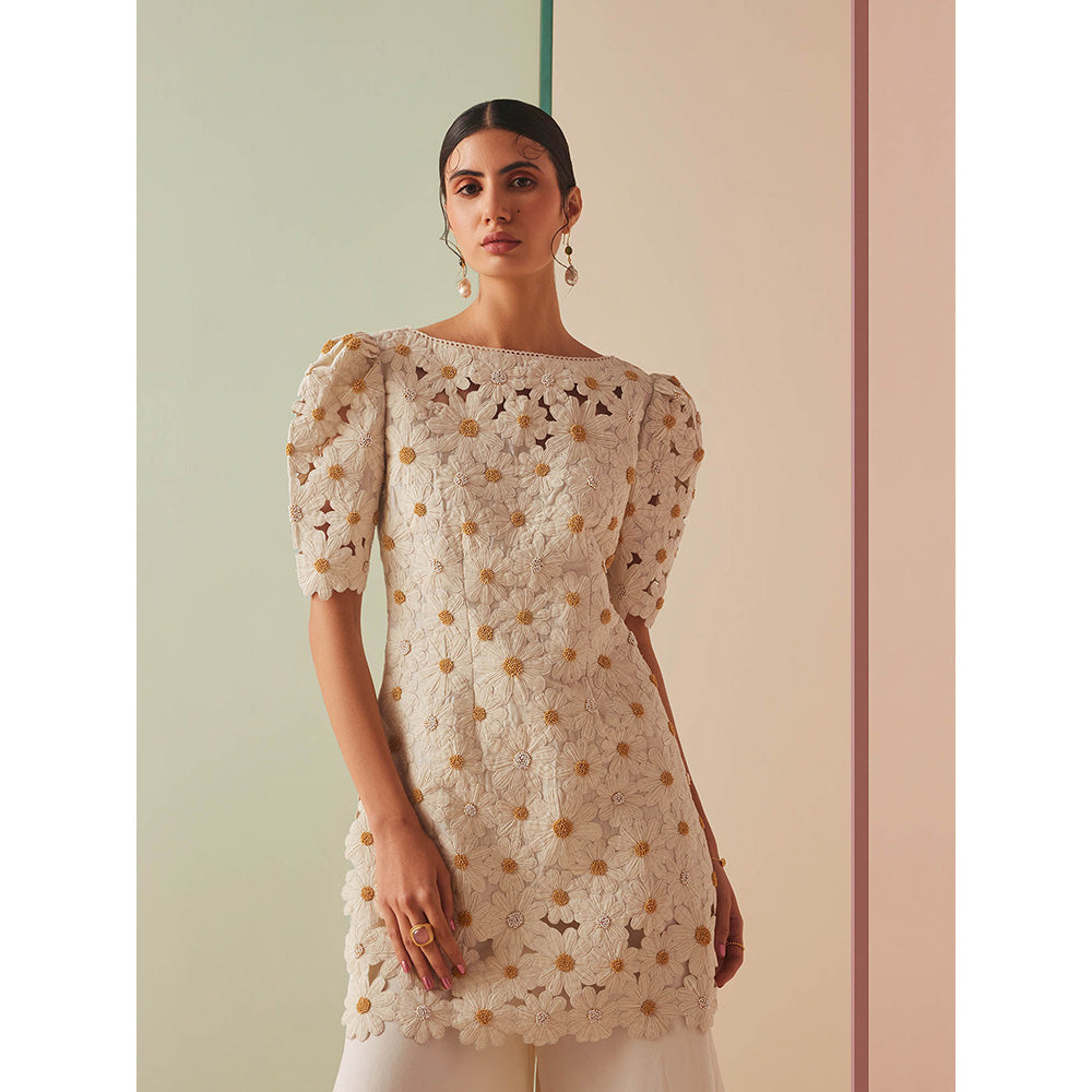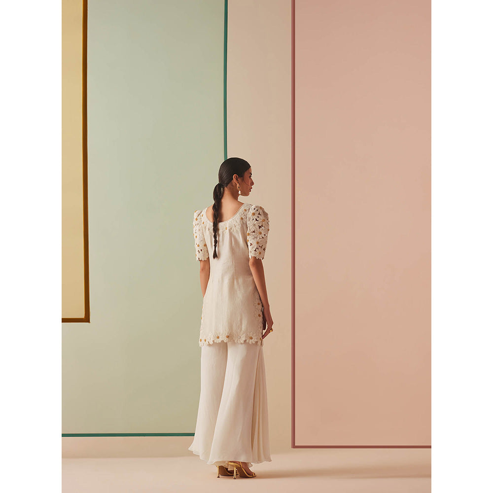 CHANDRIMA Ivory Chanderi Floral Puff Sleeves Bead Work Kurta with Sharara (Set of 2)