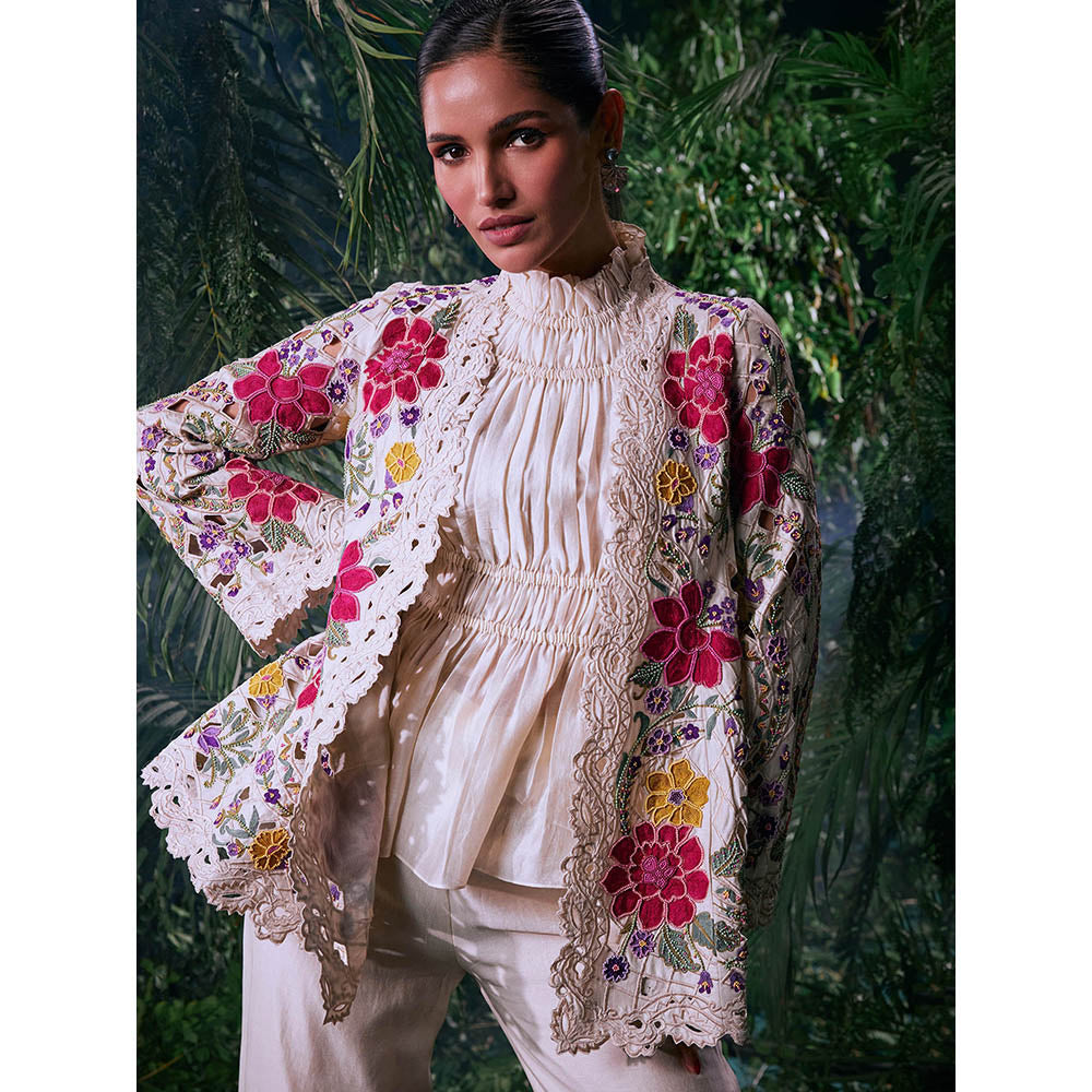 CHANDRIMA Ivory Chanderi Solid Sleeveless Ruffled Neck Lace Work Top
