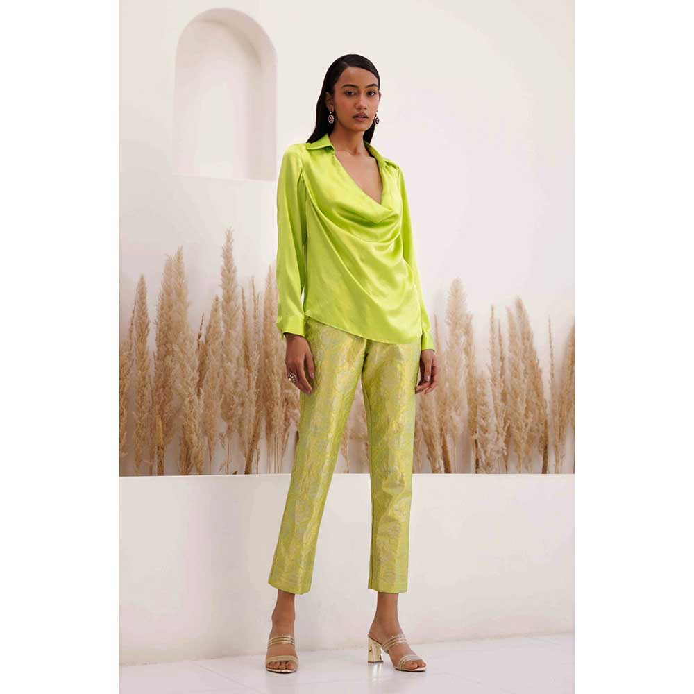 Description : A Lime Green Silk Satin Cowl Top Harmoniously Paired With Lime Green Brocade Pants.