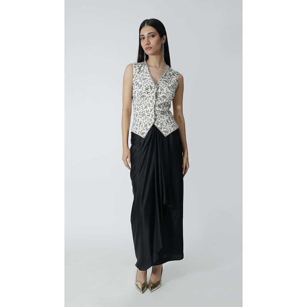 Description : An Ivory Heavy Silk Crepe Rhinestone Embellished Waistcoat, Paired with A Black Draped Silk Satin Skirt. Fabric : Heavy Silk Crepe (Waistcoat) and Silk Satin (Skirt) Colour : Ivory