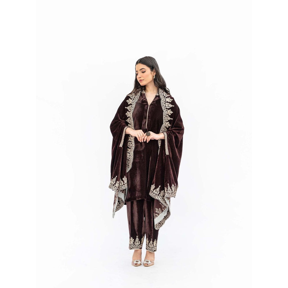 Brown Velvet Cutwork Cape with Kurta and Dupatta (Set of 3)