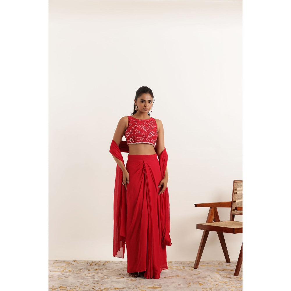 DEASHA INDIA Aria Cherry Red Pre Draped Saree with Stitched Blouse