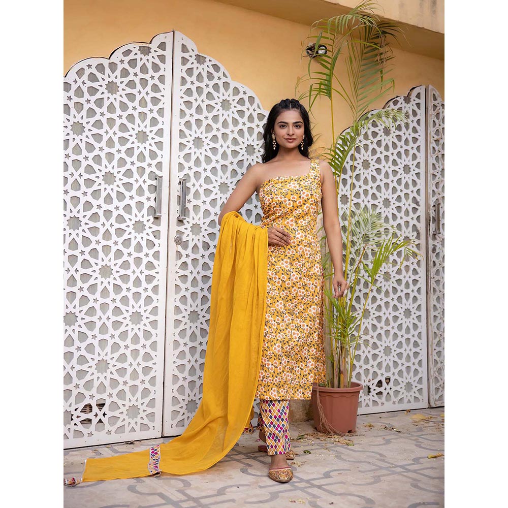 DEASHA INDIA Emaya Yellow One Shoulder Straight Kurta with Pant and Dupatta (Set of 3)