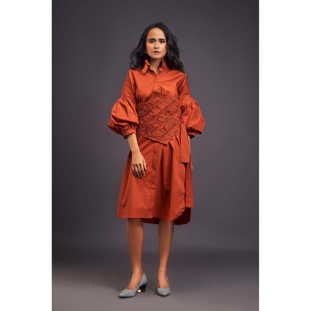 Deepika Arora Embroidered Rust Dress with Belt (Set of 2)