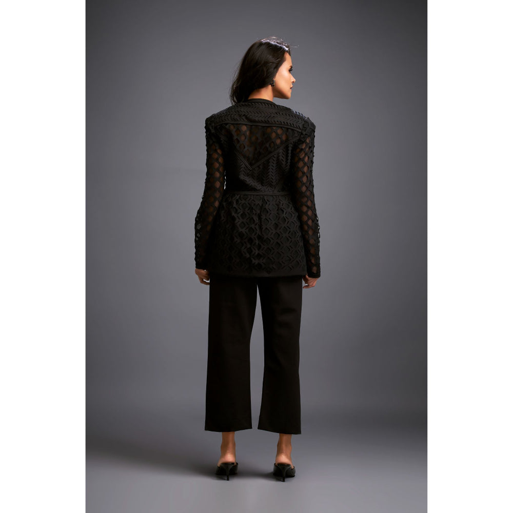 Description : Semi-Sheer Geometric Cutout Jacket With Structured Zipper Closure, Coloured Lining And Pants
