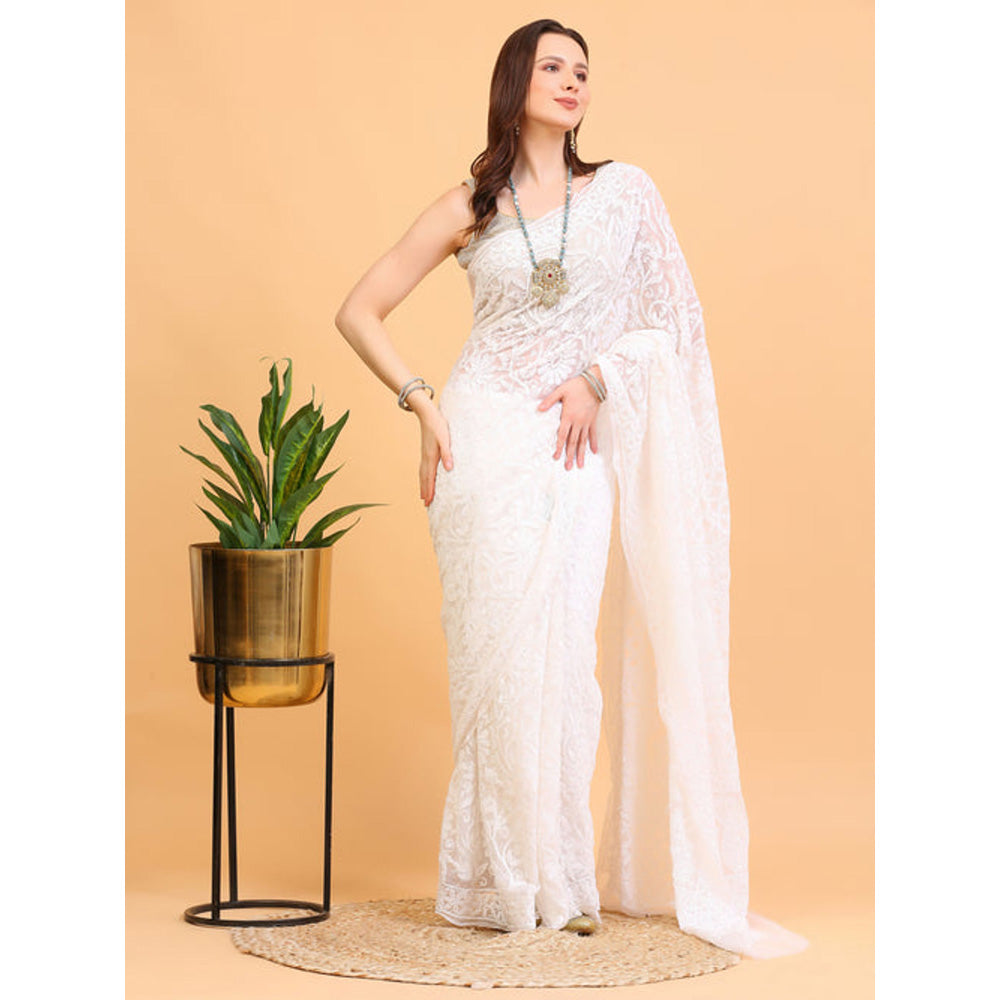 Dress & Dazzle White Lucknowi Cotton Embroidered Saree with Unstitched Blouse