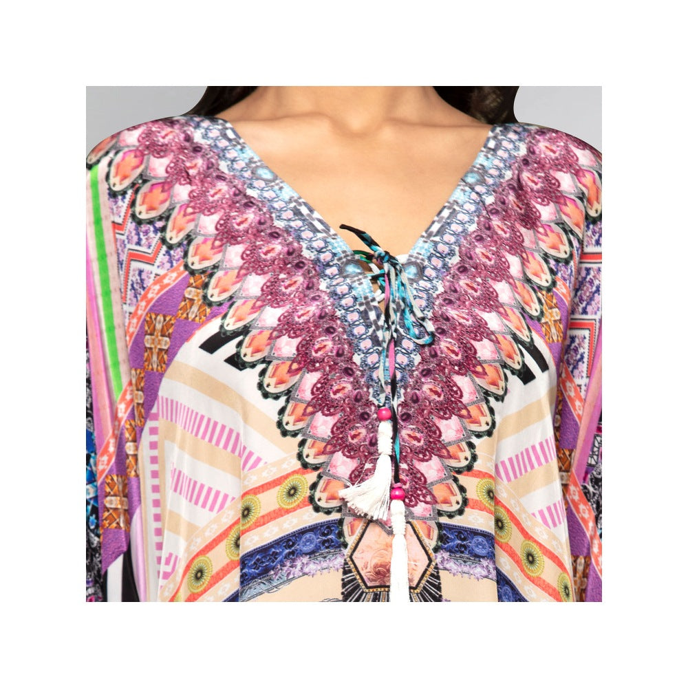 Description : Let your style stand apart from the rest. Snatch this easy-breezy pink geometric print knee-length kaftan with a tie-up neckline. Crafted in sartorial perfection from crepe material, it features a printed pattern. Wear this piece with any of your comfortable leggings and flip-flops to get a perfect beach vacay or stay-at-home look.