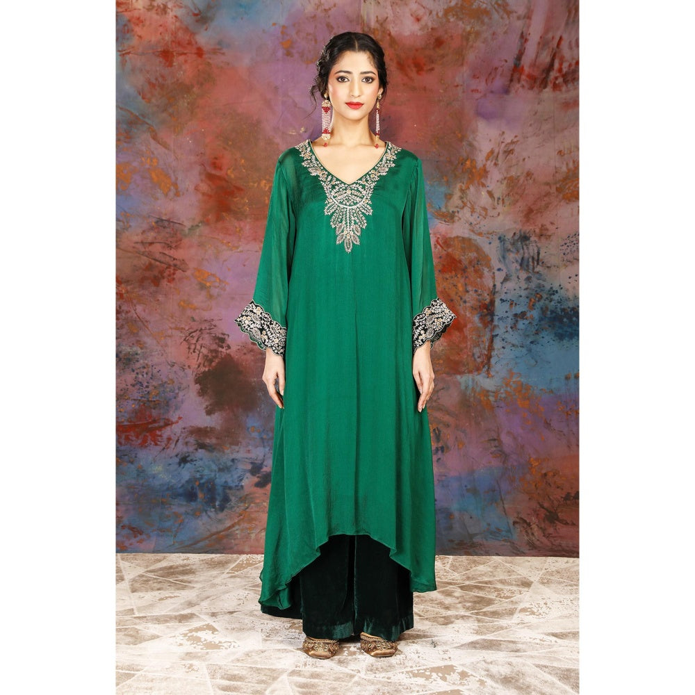 House of Supriya A-Line Asymmetrical Green Kurta With Palazzo and Slip (Set of 3)